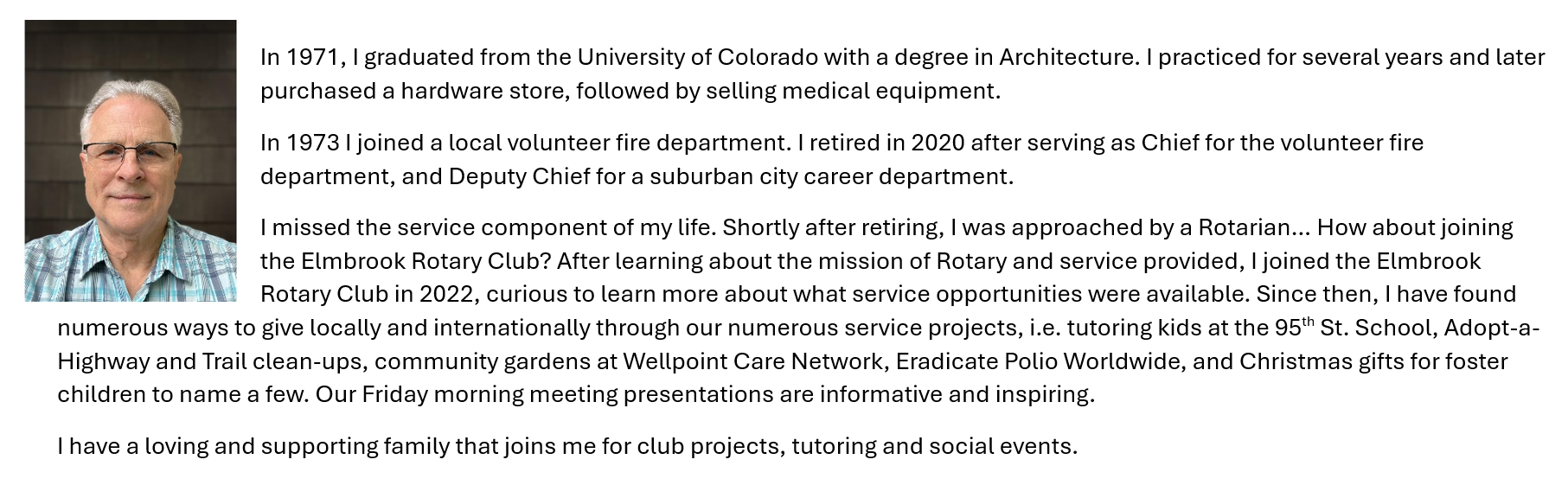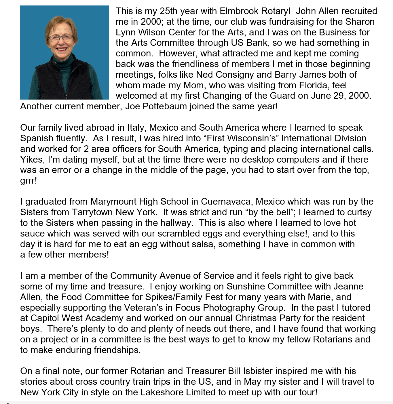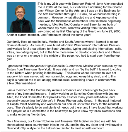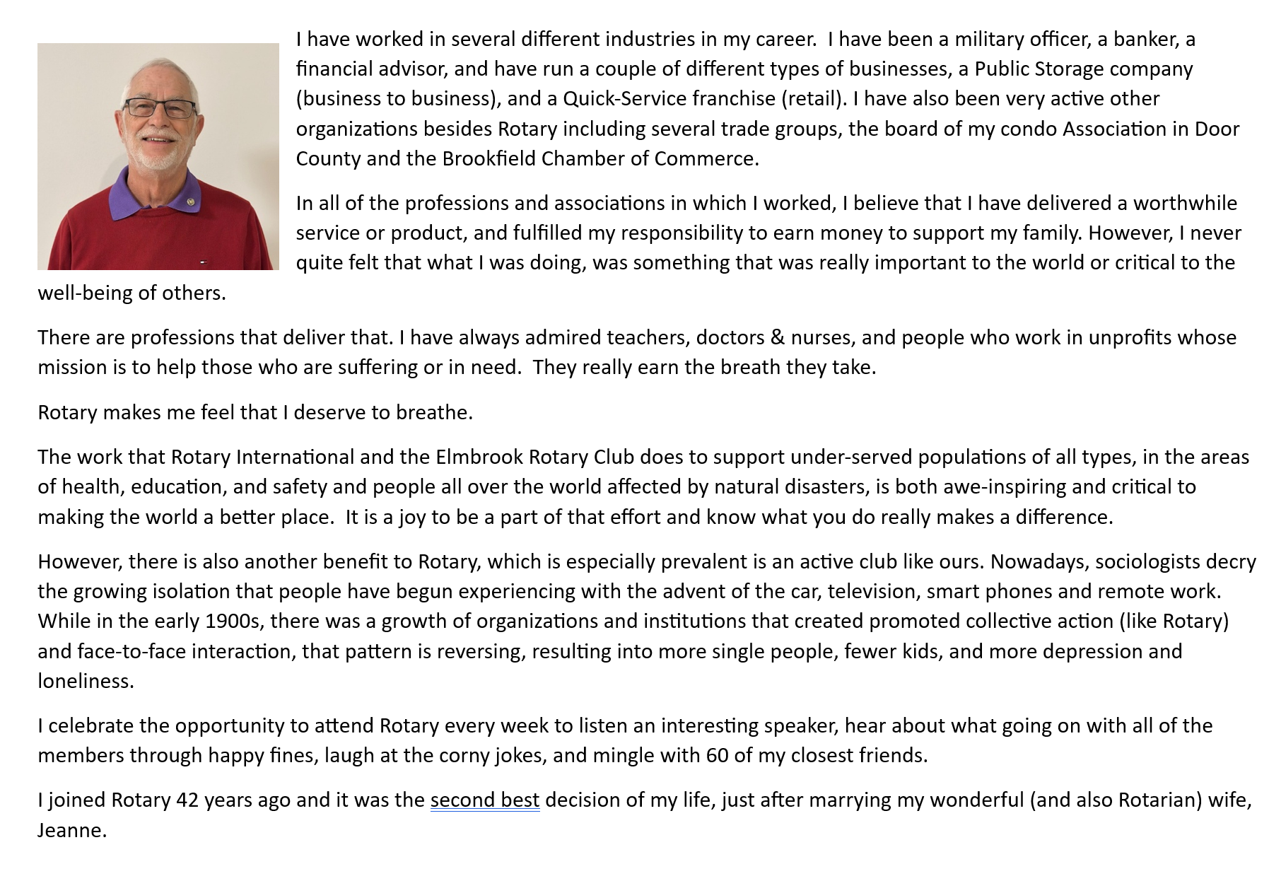 Members join Rotary for various reasons with a primary focus on “Service Above Self”. We serve local non-profit organizations, and community/ international needs through our community service projects, mini-grant funding, as well as, International Rotary projects. To view the entire bio... click on the bio.