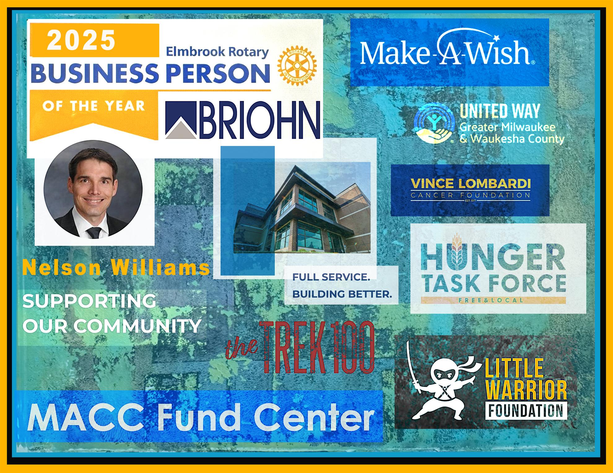 Elmbrook Rotary 2025 Business Person of the Year![]() by Ralph Gould Nelson Williams, CEO of Briohn Building Corporation, a leading design-build firm in Brookfield was awarded the Elmbrook Rotary 2025 Businessperson of the Year at a recent Friday morning meeting at St. Camillus. Nelson’s journey to the helm of Briohn is as inspiring as it is unconventional. Originally on a pre-med track at the University of Wisconsin-Madison, a pivotal conversation with his rowing coach led him to pivot towards business, a decision that ultimately brought him into the world of commercial construction. After gaining experience in web consulting and building products sales, Nelson joined Briohn in 2007, where he quickly rose through the ranks from Sales and Marketing Director to Vice President, and then CEO in 2011. Under Nelson’s leadership, Briohn has flourished not only as a builder of spaces but as a builder of community. He’s a passionate advocate for team culture, often saying that people he works with are what keep him coming to work every day. That spirit extends beyond the office. Nelson is an avid cyclist and endurance sports enthusiast who has rallied his team around charitable causes like the Trek 100, raising hundreds of thousands of dollars for cancer research along the way. “We support a number of initiatives designed to strengthen our community, including education, cancer research, adoption related causes, and wellness.” “We have been active with the Trek 100 & the MACC Fund, the Medical College of Wisconsin, Vince Lombardi Cancer Fund, St. Augustine Preparatory Academy, University of Wisconsin, Marquette University, United Way, Make a Wish, Little Warrior, Hunger Task Force, and many more.” Nelson lives in Elm Grove with his wife and two children, who are in High School and Middle School at Brookfield Academy. Thank you, Nelson for exemplifying the ideals of Rotary “Service Above Self”. |