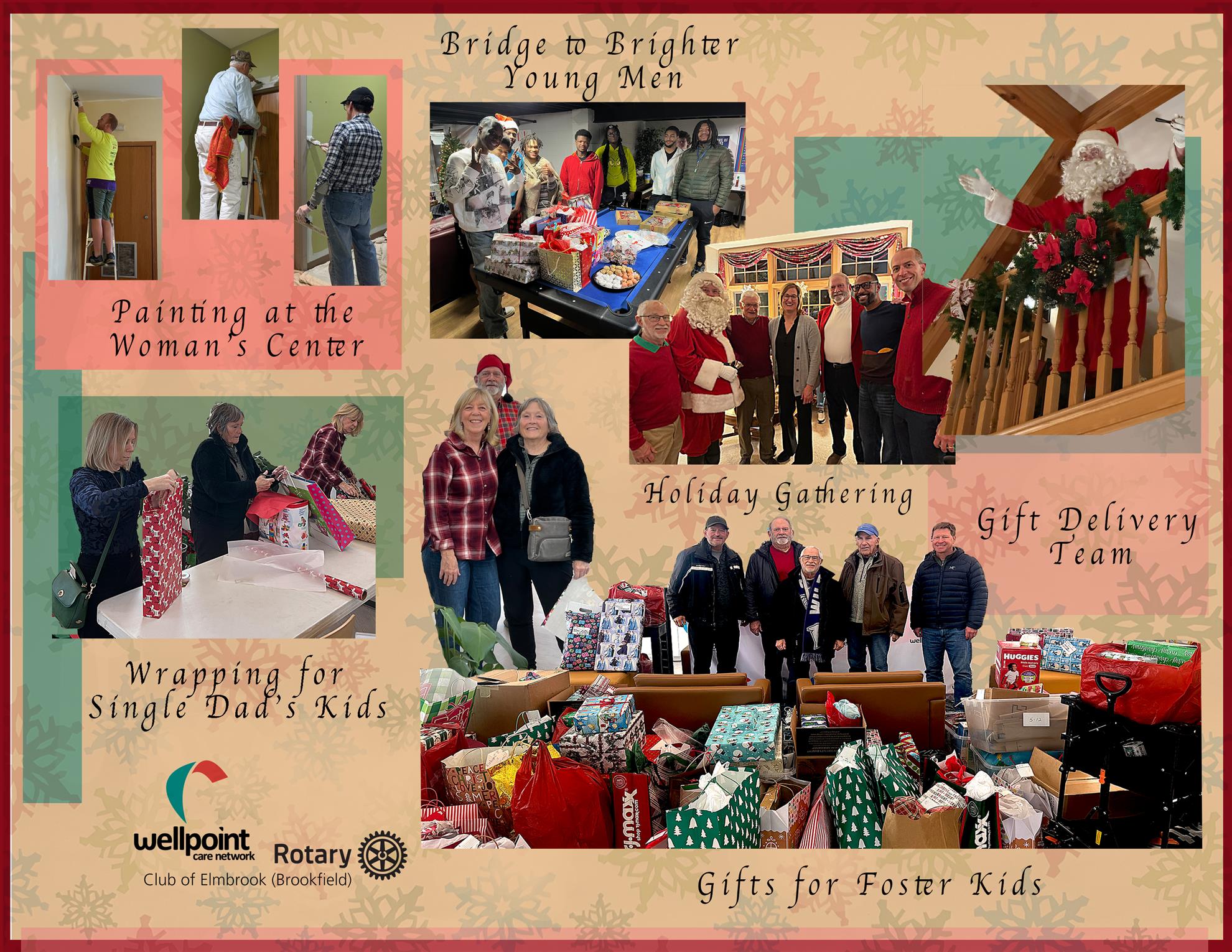 The Year-Round Season of Giving![]() The Elmbrook Rotary Club over the years has partnered with many local and worldwide non-profit organizations serving communities and people around the globe. The Holiday Season provides the club with many opportunities for giving and service. Recently the club was involved with the following holiday projects: Wellpoint Care Network by Jack Nelson 150, 15, 150... that's how many Foster Kids, Young Men and Single Dads Elmbrook Rotary helped with this year's Holiday Gifting program. While we make the gifts to the Foster kids and the young men anonymously, we did get to see many of the single dads as they came to the Rotary Wrapping station at the Diapers for Dads event at Wellpoint. We sure did help to make a great start to the Holidays for these Dads who are stepping up to take care of their kids. This was our first year setting up a wrapping station. Luckily, we had some excellent wrappers and were not dependent on Jack Nelson's "wrapping skills" . Thanks to Sue Cerletty, Evonne Zalewski, Cathy Selzer and her sister Jenny Hensgen, Nick Sgarlata his wife Carrie and son Gunner. Everyone involved said they hoped this would become an annual event. Bridge to Brighter