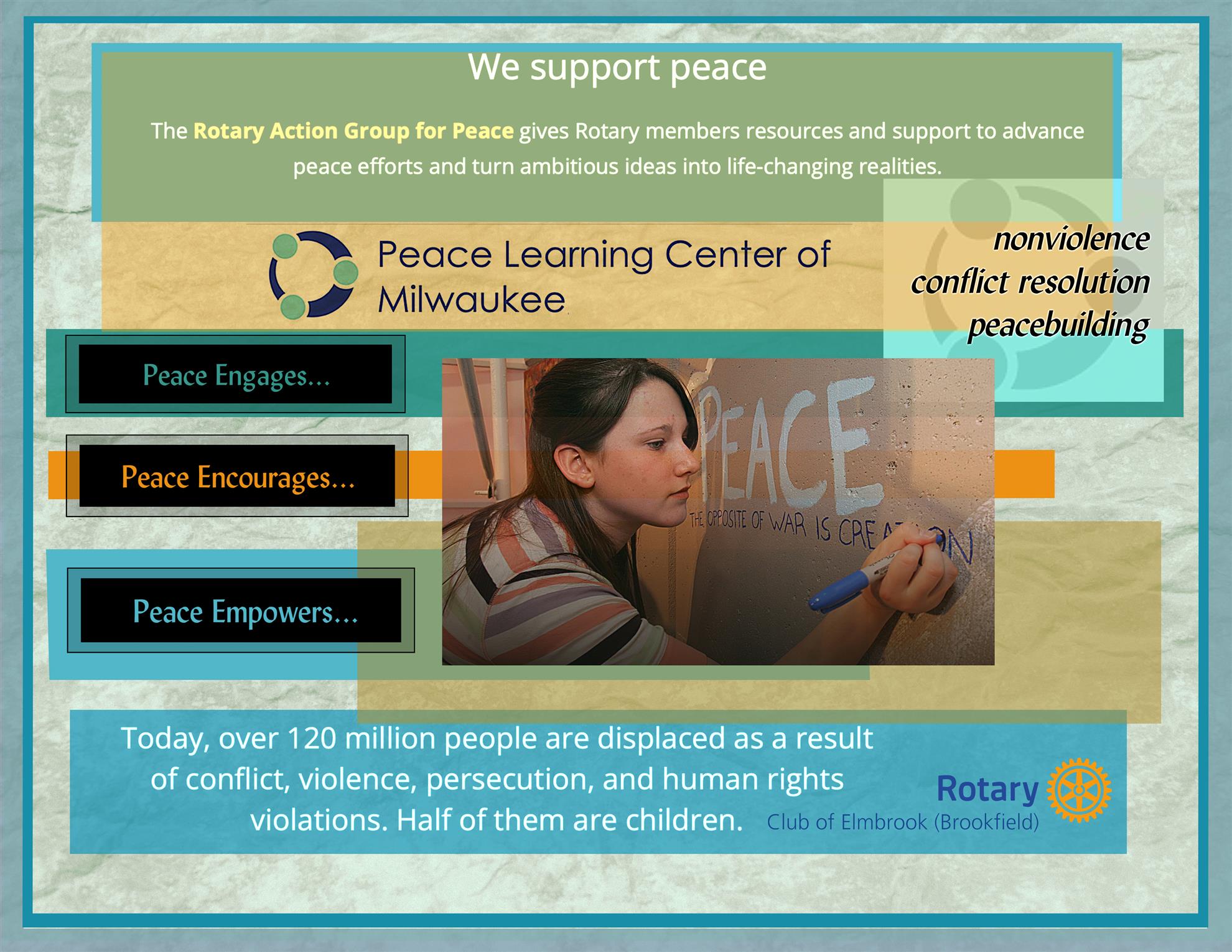 Peace Learning Center of Milwaukee![]() Promoting peace is the cornerstone of the Elmbrook Rotary Peacebuilder Committee mission. As part of peace sharing, Tracy Ebert from the Peace Learning Center recently presented the Center’s mission, goals, and activities with the club. Peace Learning Center of Milwaukee is a nonprofit organization dedicated to teaching youth and adults in the Milwaukee area effective, standards-based programs focused on healthy communication and nonviolent conflict resolution. Their workshops empower participants to manage conflict in their daily lives and foster respect for self, others, and the environment. The mission is to be a catalyst in the community for nonviolent conflict management and respect for all. Programs and Impact